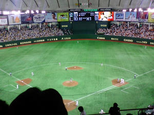 今日は東京ドームに巨人阪神戦見に来てます。私は何でだか新潟にいた時から阪神ファンです。あと数週間でエイトがここでコンサートするのねん。この席は野球見るには良いけどコンサートだとやっぱ豆に見えちゃうねぇ。それにしても前のオッサンの頭がジャマで打席が見えん!
