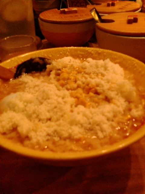 テレビによく出てる「チーズラーメン」を食べました。写真はチーズの山を崩してしまった後ですがもっとてんこ盛りになってました。